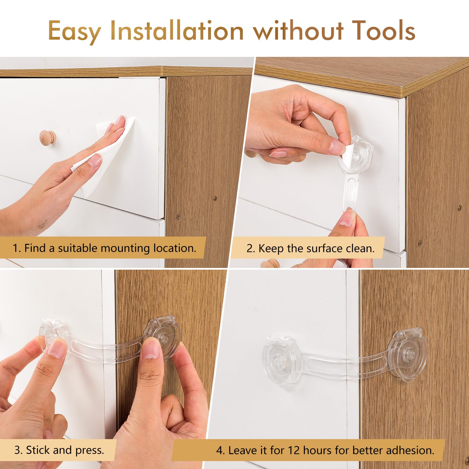 AiQInu transparent safety locks help prevent children from accidentally opening cabinets and drawers, keeping them away from dangerous items. Made from durable and flexible ABS material, which is non-toxic and odorless. Easy to install without drilling or tools – simply stick the lock to the desired surface. The strong adhesive tape reaches maximum adhesion 12 hours after installation. Suitable for various surfaces and furniture, and the transparent design blends into any interior. The set includes 9 locks.