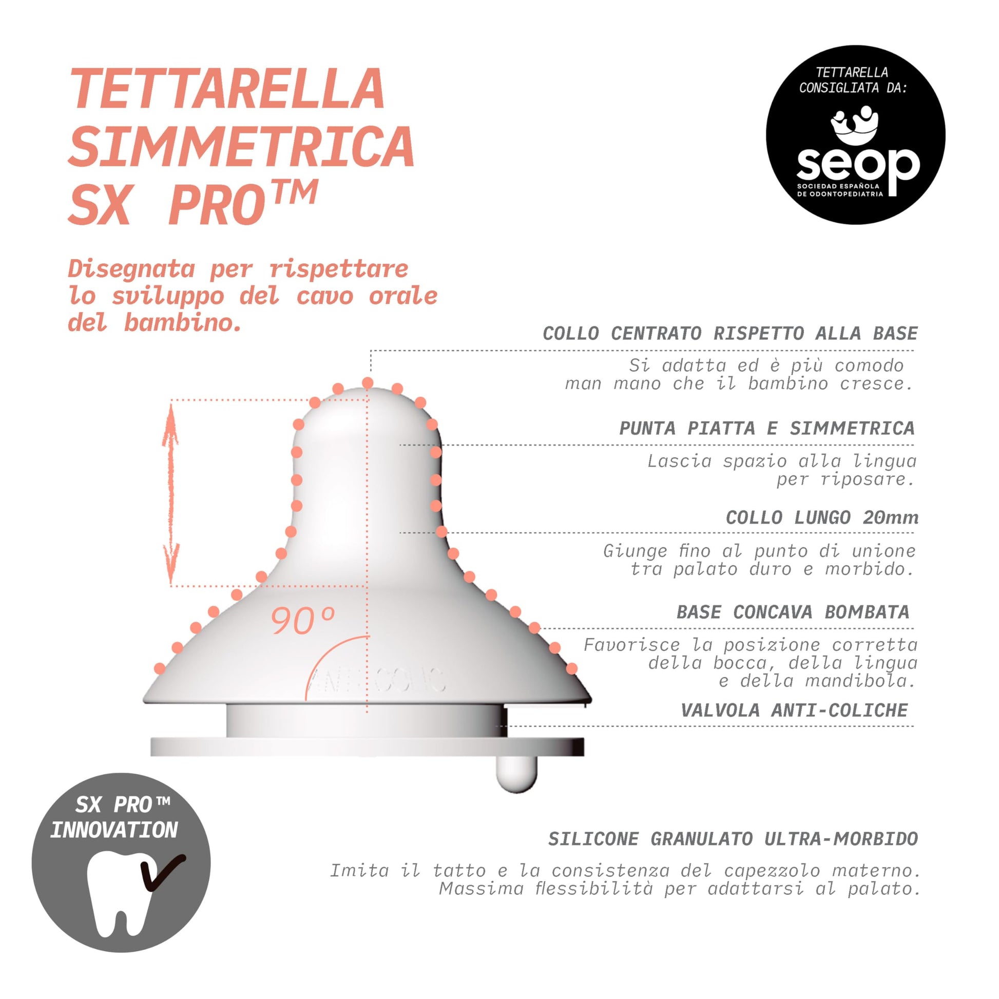 Suavinexi 2-osaline pudelikomplekt sisaldab kahte 360 ml pudelit tiheda vooluga (L) füsioloogilise SX Pro silikoonluti ja koolikute vastase ventiiliga. Need pudelid on mõeldud alates 6. elukuust, aidates ennetada koolikuid ja luksumist õhu sissehingamise tõttu. Pehme, liivapritsiga töödeldud silikoon imiteerib ema rinna tekstuuri ja paindlikkust, võimaldades keelel jääda loomulikku asendisse. Pudel on kerge ja sirge kujuga, et beebil oleks seda lihtne käes hoida. SX Pro lutid on soovitatud Hispaania Hambaarstide Ühingu (SEOP) poolt.