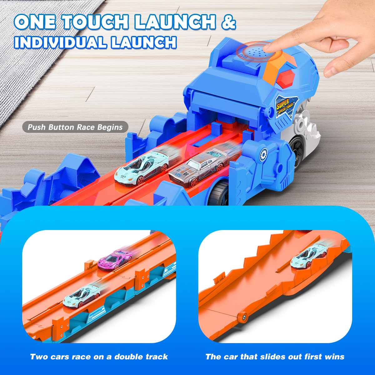 | Funktsioonid | Valgus- ja heliefektid, kahe- ja üheauto stardifunktsioon, dinosauruse „neelamisfunktsioon”, rallirada, kandekäepide |