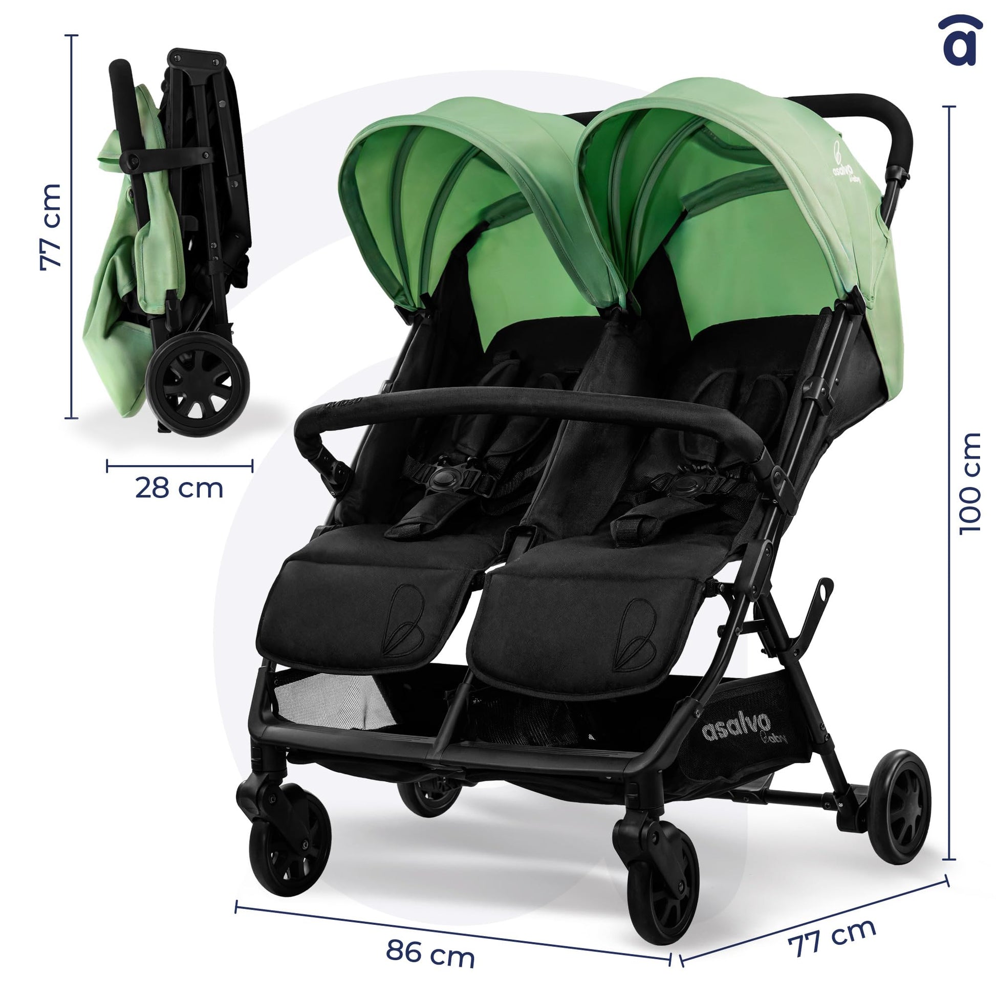 Asalvo Double Henry kaksikkäru vastsündinule kuni 15 kg, reguleeritav ja kokkupandav, roheline