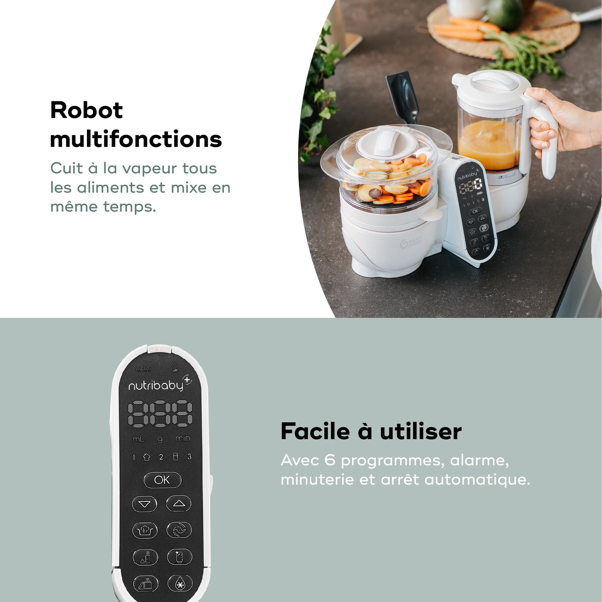 Babymoov Nutribaby(+) on mitmeotstarbeline beebitoidu valmistaja, mis ühendab aurutamise, segamise, sulatamise, soojendamise, steriliseerimise ja pudelisoojenduse ühes seadmes. Kahe eraldi aurukorviga säilitab see toidu maitse ja vitamiinid ning võimaldab kohandada tekstuuri vastavalt beebi vanusele. Suure 2,2-liitrise mahutavusega saab korraga valmistada mitu toidukorda – ideaalne abiline koduseks beebitoidu valmistamiseks. Seade on varustatud taimeri, helisignaali ja automaatse väljalülitusega mugavaks ja turvaliseks kasutamiseks.