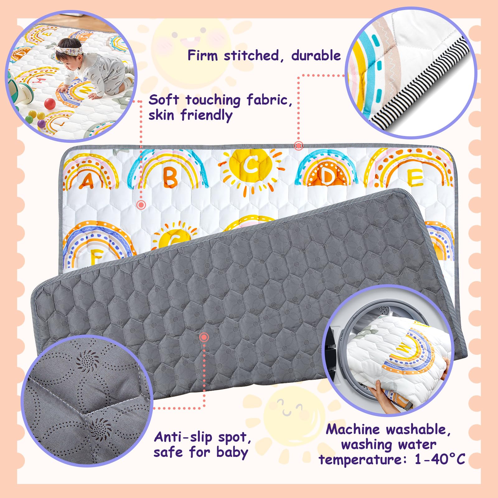 Funsland mängumatt loob beebile turvalise ja mugava keskkonna roomamiseks, mängimiseks ja õppimiseks. Pehmest puuvilla ja polüestri segust valmistatud matt on 1 cm paksune, pakkudes lisapehmendust kukkumiste puhul. Värvikad mustrid – vikerkaar, päike, ilmaolud ja tähestik – aitavad arendada lapse värvitaju ja tunnetust. Libisemisvastane põhi ja tugevdatud servad muudavad mati vastupidavaks ja ohutuks. Matti on lihtne kokku panna, hoiustada ja puhastada ning see sobib kasutamiseks nii toas kui ka õues.