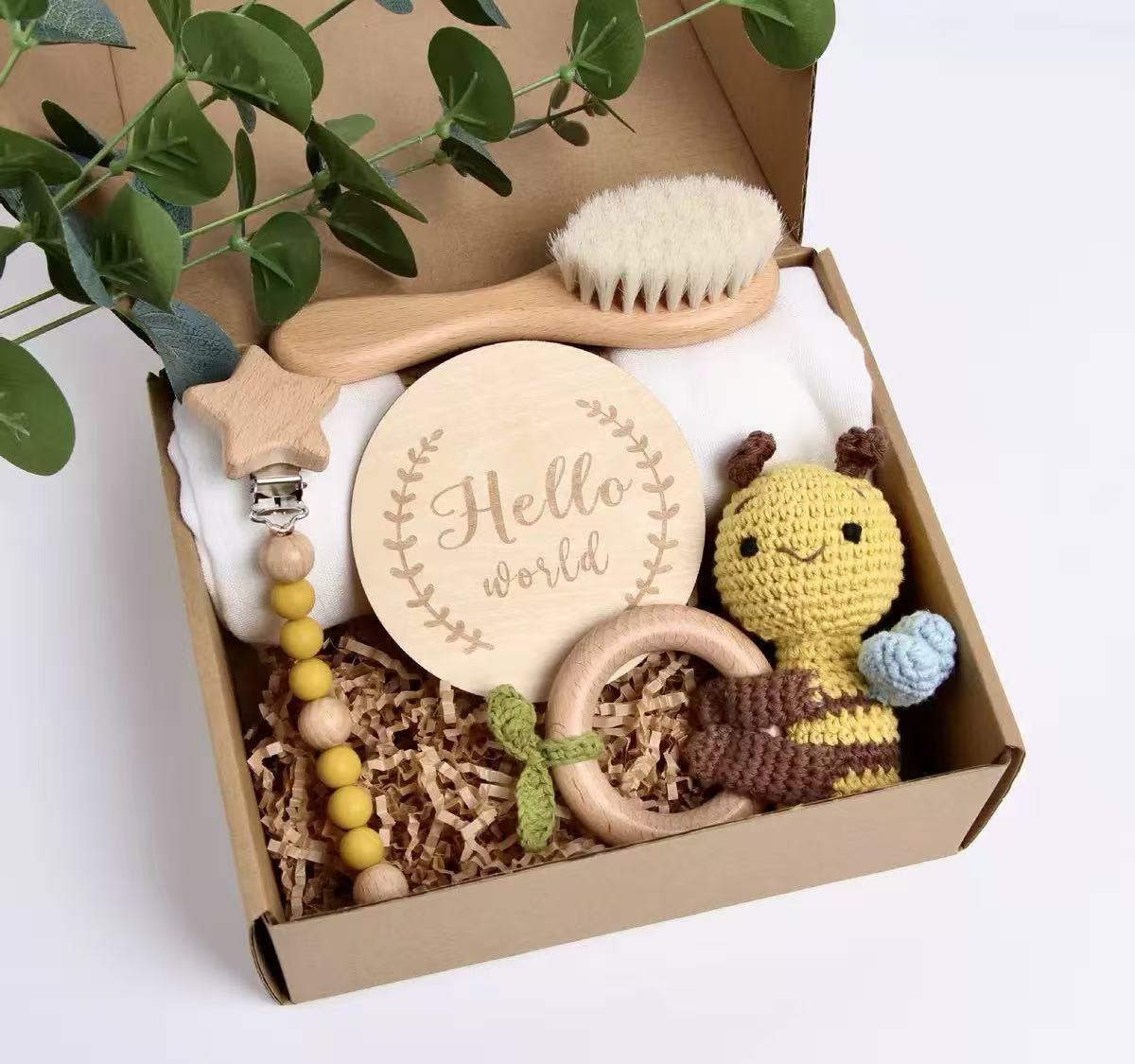 Komplekti sisu | Musliintekk 120×120 cm, juuksehari, silikoonist/puidust lutikett, puidust närimisrõngas loomakujuga, “Hello World” mälestustahvel |