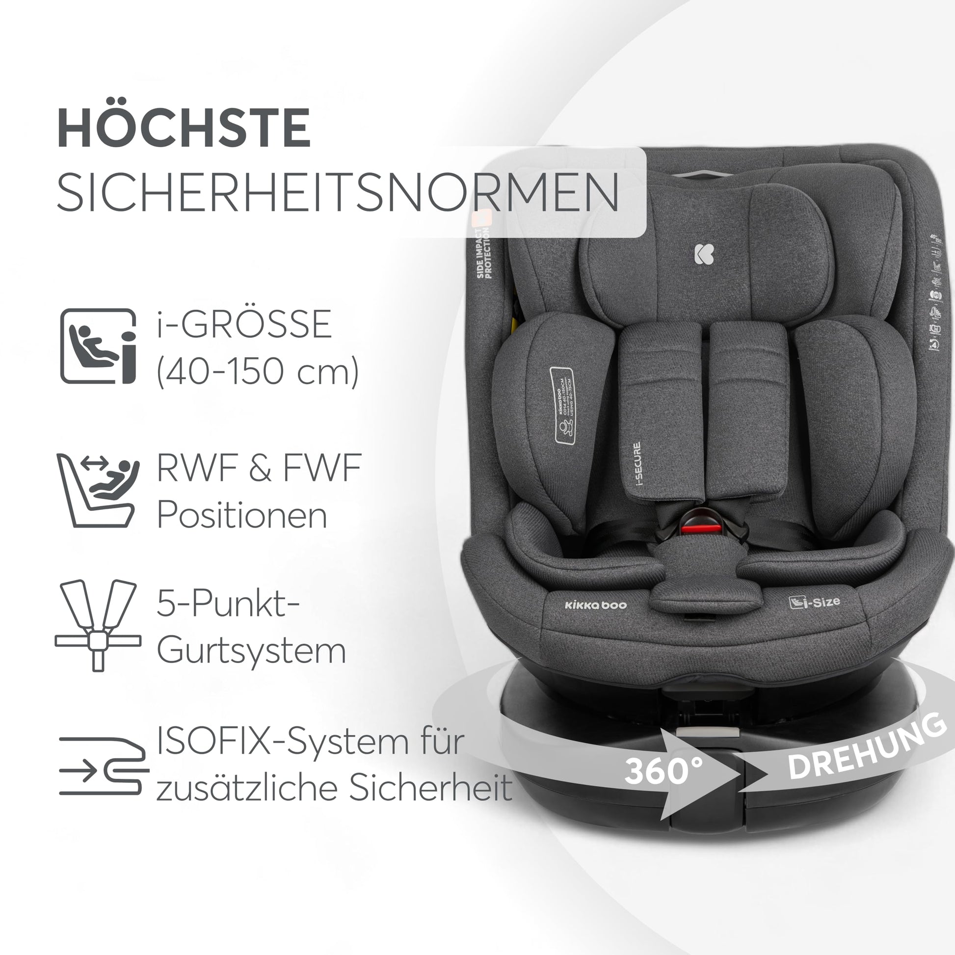 KikkaBoo i-SECURE turvatool kasvab koos lapsega alates sünnist kuni 12. eluaastani (0–36 kg / 40–150 cm). Tooli saab kasutada nii selg- kui näoga sõidusuunas, pakkudes mõlemas asendis 4 kaldenurka, et tagada mugav istumisasend igas vanuses. 360° pöörlemissüsteem võimaldab last hõlpsalt autosse asetada ja asendit vahetada. Turvatool vastab kõrgeimale i-Size R129/03 standardile ning on TÜV SÜD poolt testitud ja heaks kiidetud. ISOFIX-kinnituse, tugijala ja külgkokkupõrke kaitse (SPS) kombinatsioon tagab stabiilse paigalduse ja suurema turvalisuse. Pehme täispikk istmepadi ja reguleeritav peatoe kõrgus (12 asendit) pakuvad maksimaalset mugavust nii lühikestel kui ka pikkadel sõitudel.