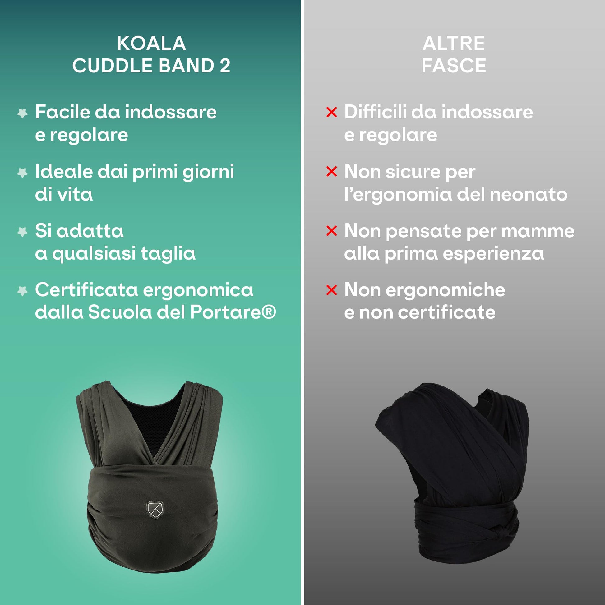 The Koala Babycare Cuddle Band 2.0 is a practical and comfortable baby wrap that slips on like a T-shirt. Made from soft, breathable organic cotton, it is suitable from the very first days of life—even for premature babies. Thanks to the ergonomic back support and adjustable rings, your baby's weight is evenly distributed, reducing strain on the parent. Certified by the Italian Babywearing Education Centre, it keeps your baby in the orthopedically recommended “M-position” and supports natural motor development.
