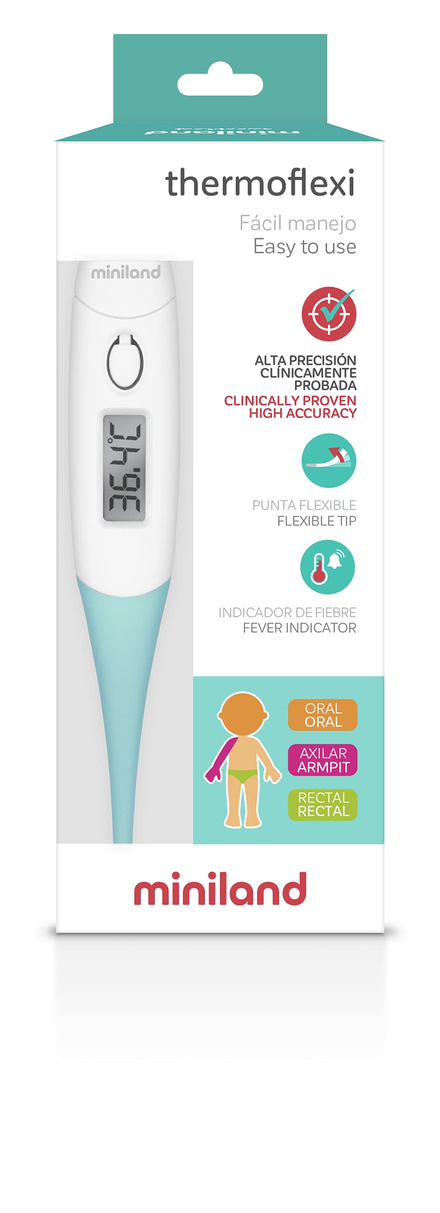 Miniland Thermoflexi on kiire ja usaldusväärne digitaalne termomeeter, mis mõõdab kehatemperatuuri vaid 10 sekundiga. Tänu painduvale otsikule sobib see kasutamiseks suuõõnes, kaenla all või rektaalselt. Termomeetril on palavikuhoiatus, mis annab märku, kui temperatuur ületab 37,8 °C. Väike ja vastupidav seade sobib hästi koduseks kasutamiseks kogu perele.
