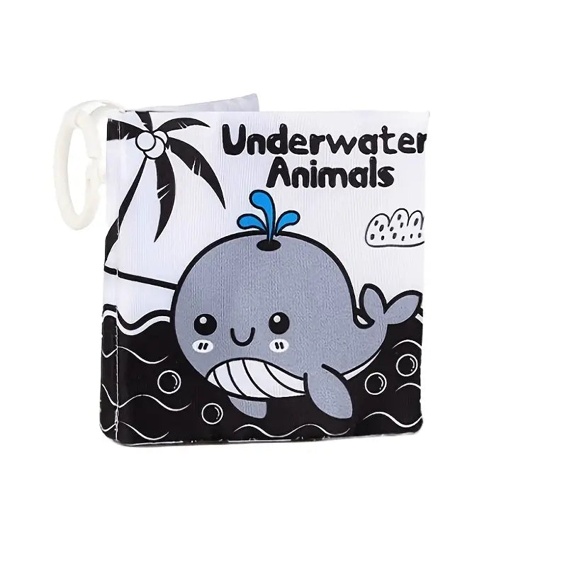 Pehme beebiraamat “Veealused loomad” – must-valge kontrastne õpiraamat beebidele