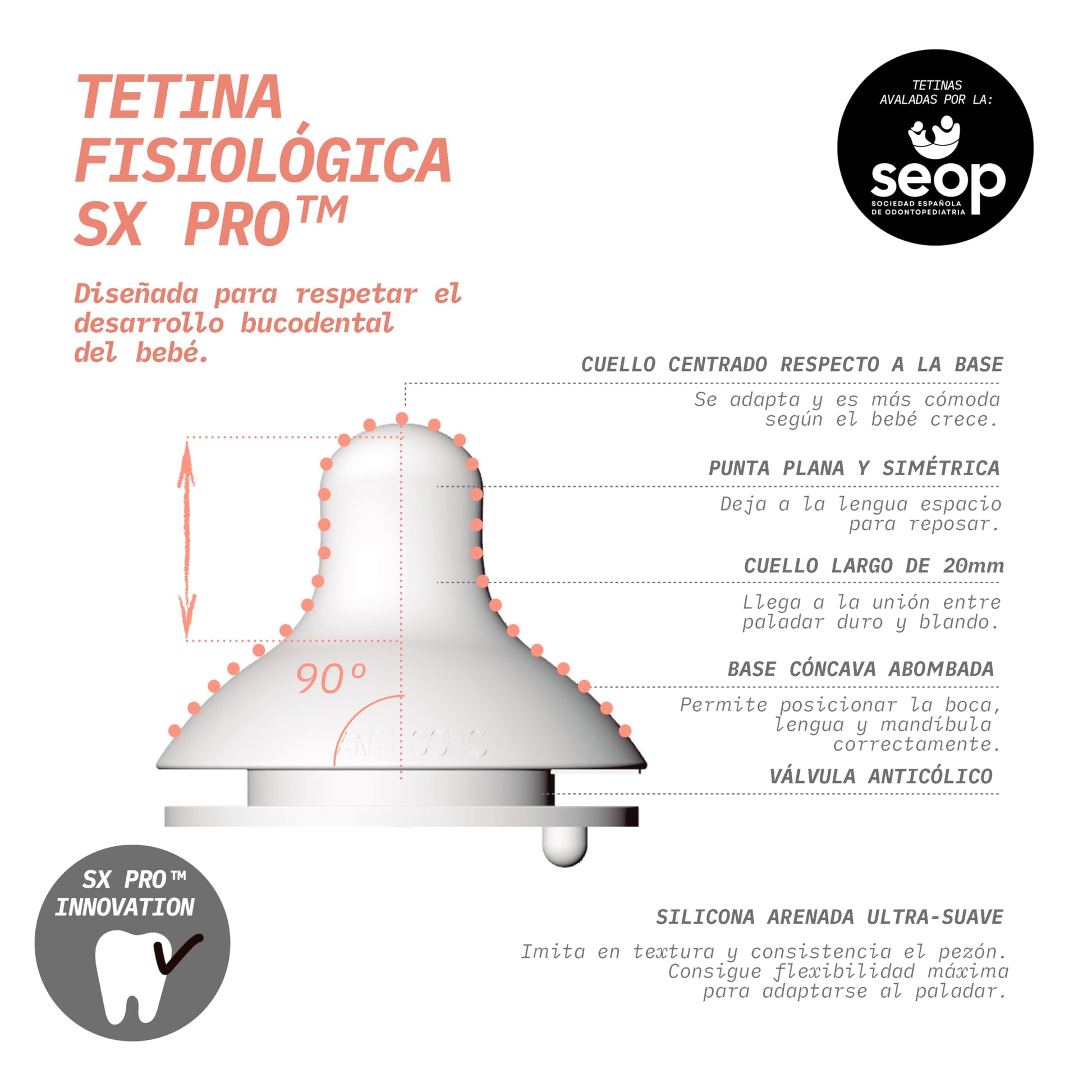 Suavinex SX Pro lutipudel on mõeldud vanematele beebidele alates 6. elukuust, kes vajavad tihedama vooluga toitu nagu vedel puder. Füsioloogilise kujuga lutt aitab säilitada keele loomulikku asendit, nagu rinnaga toitmisel, toetades suuõõne tervislikku arengut. Lutt on valmistatud ülipehmest liivapritsitud silikoonist, mis imiteerib rinnanibu tekstuuri ja painduvust. Sisseehitatud antikoolikute ventiil aitab vältida õhu neelamist, mis võib põhjustada koolikuid või hikka. Pudel on kerge ja sirge kujuga, sobides hästi väikestele kätele.