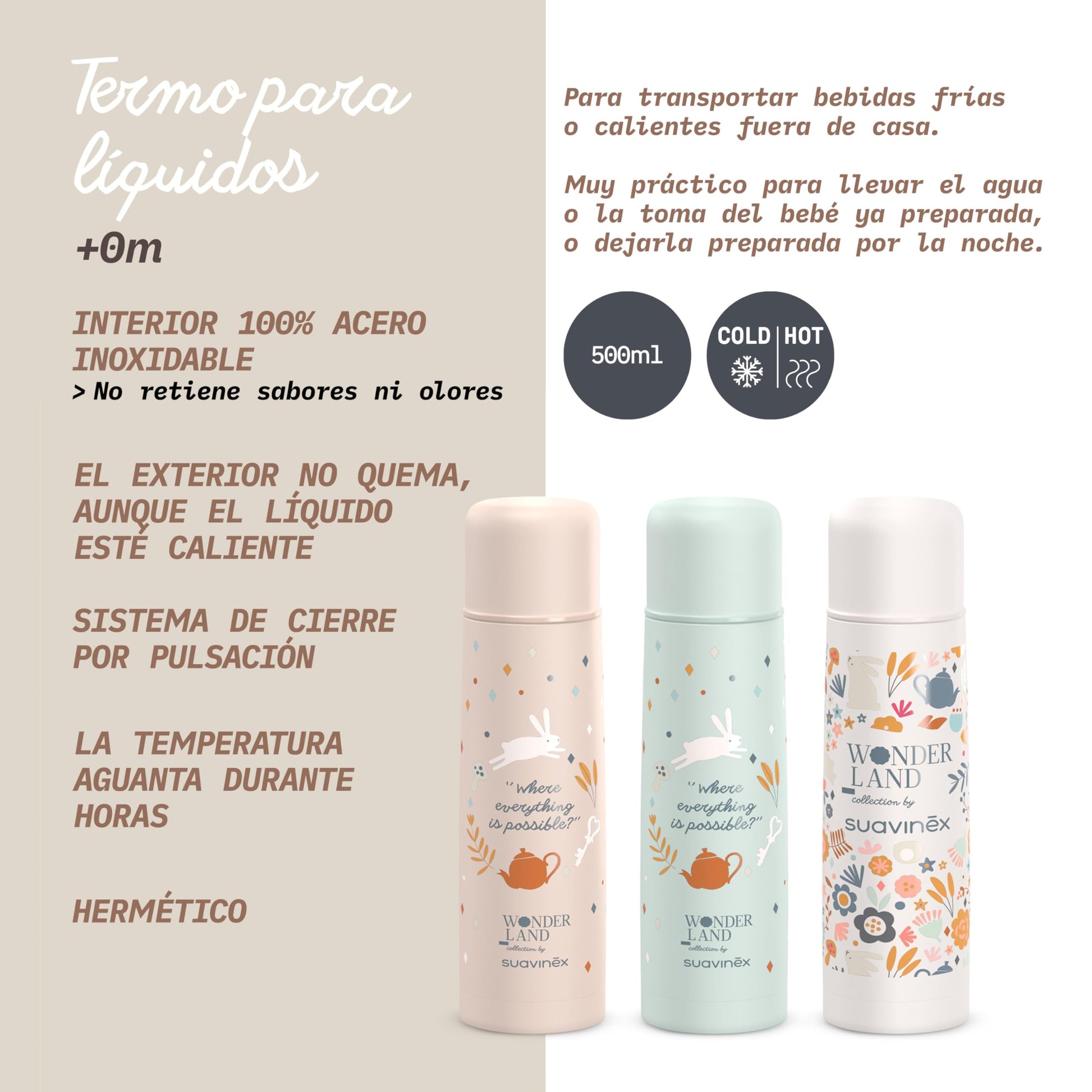 Suavinex roostevabast terasest termospudel roosast Wonderland kollektsioonist hoiab joogid kuumad või külmad kuni 6 tundi. Termos on ideaalne abivahend beebi toitmiseks kodus, öisteks piimakordadeks või jalutuskäikudeks. Hermeetiline keeratav ja vajutusmehhanismiga kork tagab turvalise, lekkekindla ja hügieenilise kasutuse. Tänu topeltseinalisele disainile ei kandu temperatuur välispinnale, mistõttu on termos käes alati mugav ja ohutu. Valmistatud vastupidavast roostevabast terasest, mis ei ima lõhnu ega maitseid. Kvaliteetne ja vastupidav, kuid ei sobi mikrolaineahjus ega nõudepesumasinas kasutamiseks.