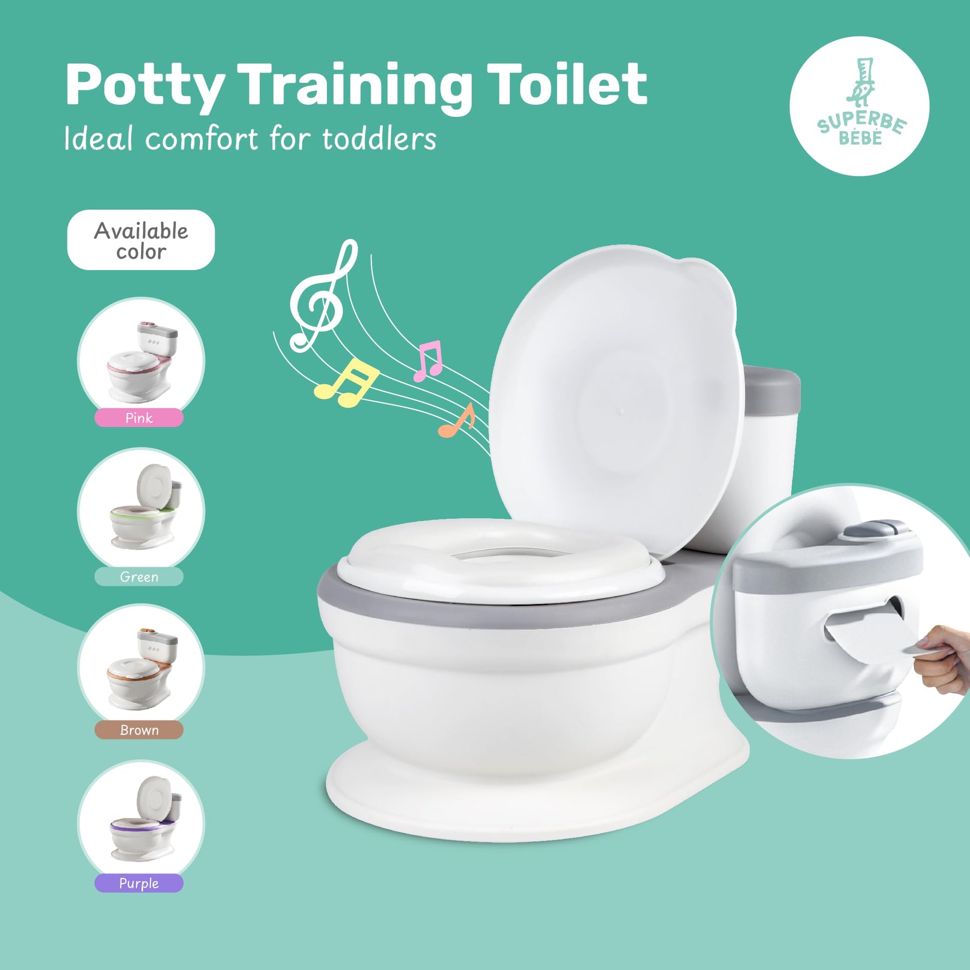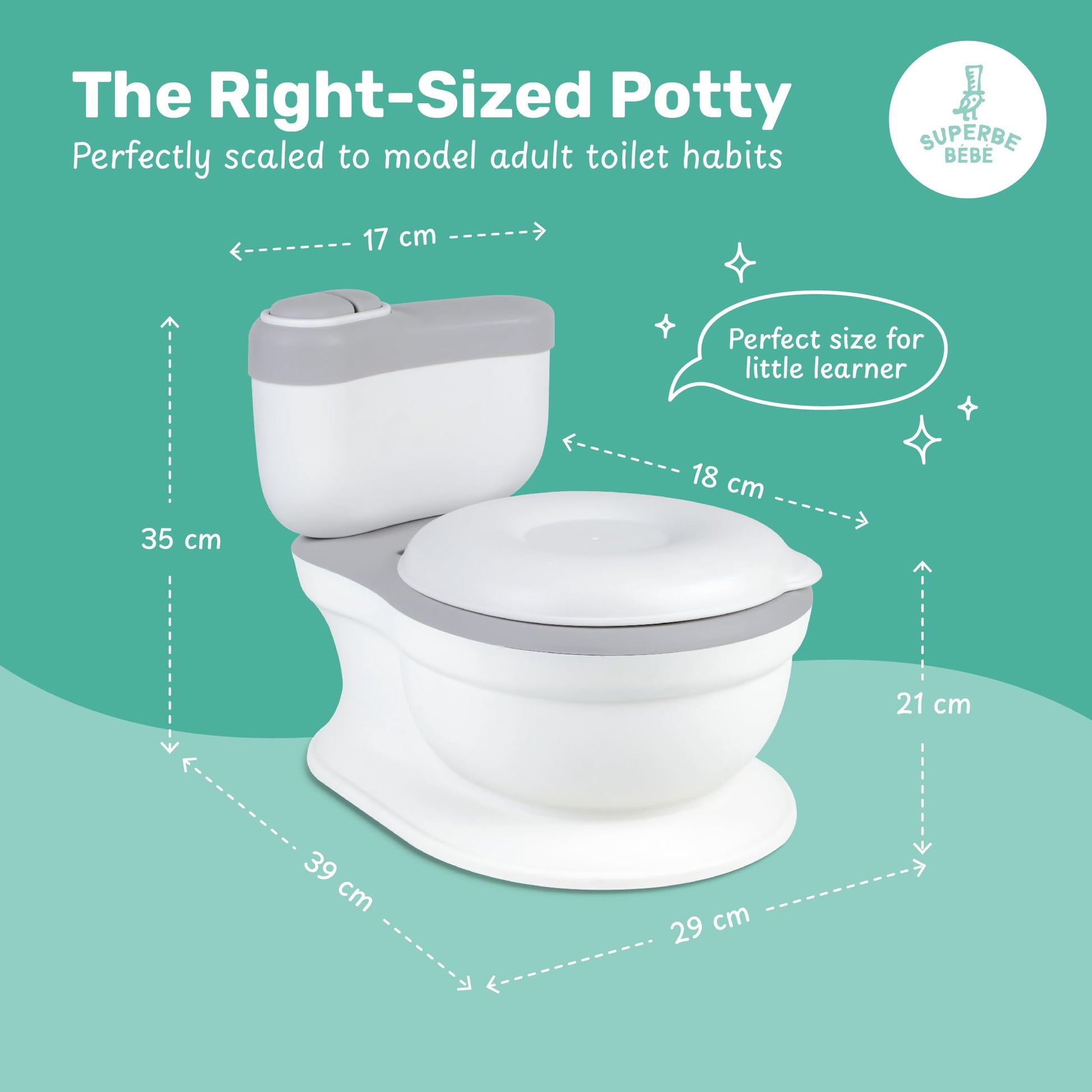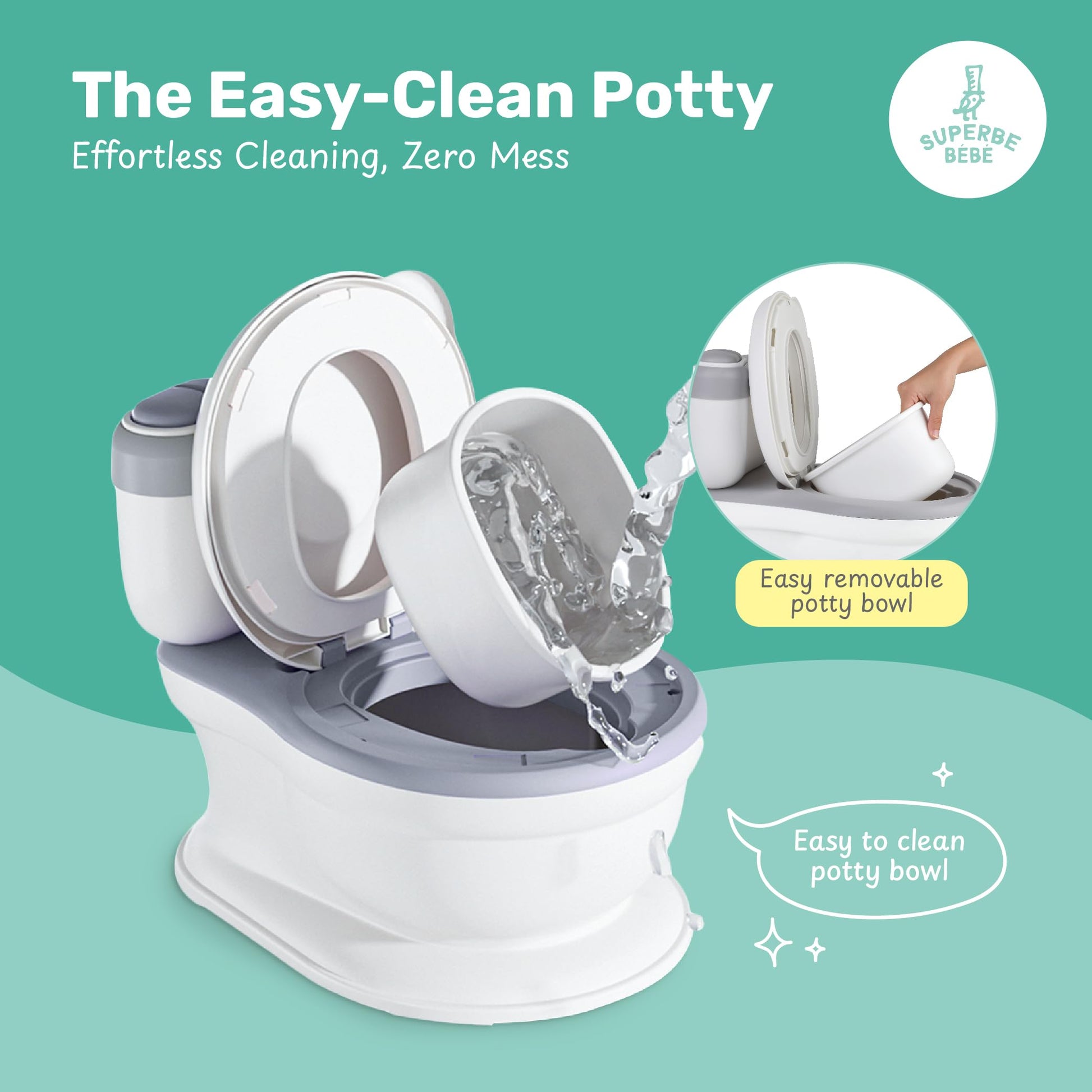 Superbé Bébé heliefektiga treeningpott muudab potitreeningu lapsele lõbusaks ja motiveerivaks. Pott on kujundatud nagu päris WC ning sellel on loputusheli ja muusikaga funktsioonid, mis aitavad lapsel harjuda tualeti kasutamisega mängulisel viisil. Eemaldatav sisuanum teeb puhastamise lihtsaks, samas kui tagumises osas olev panipaik võimaldab hoida niiskeid salvrätikuid käepärast. Libisemiskindel ja stabiilne disain tagab ohutu kasutamise nii kodus kui reisil.