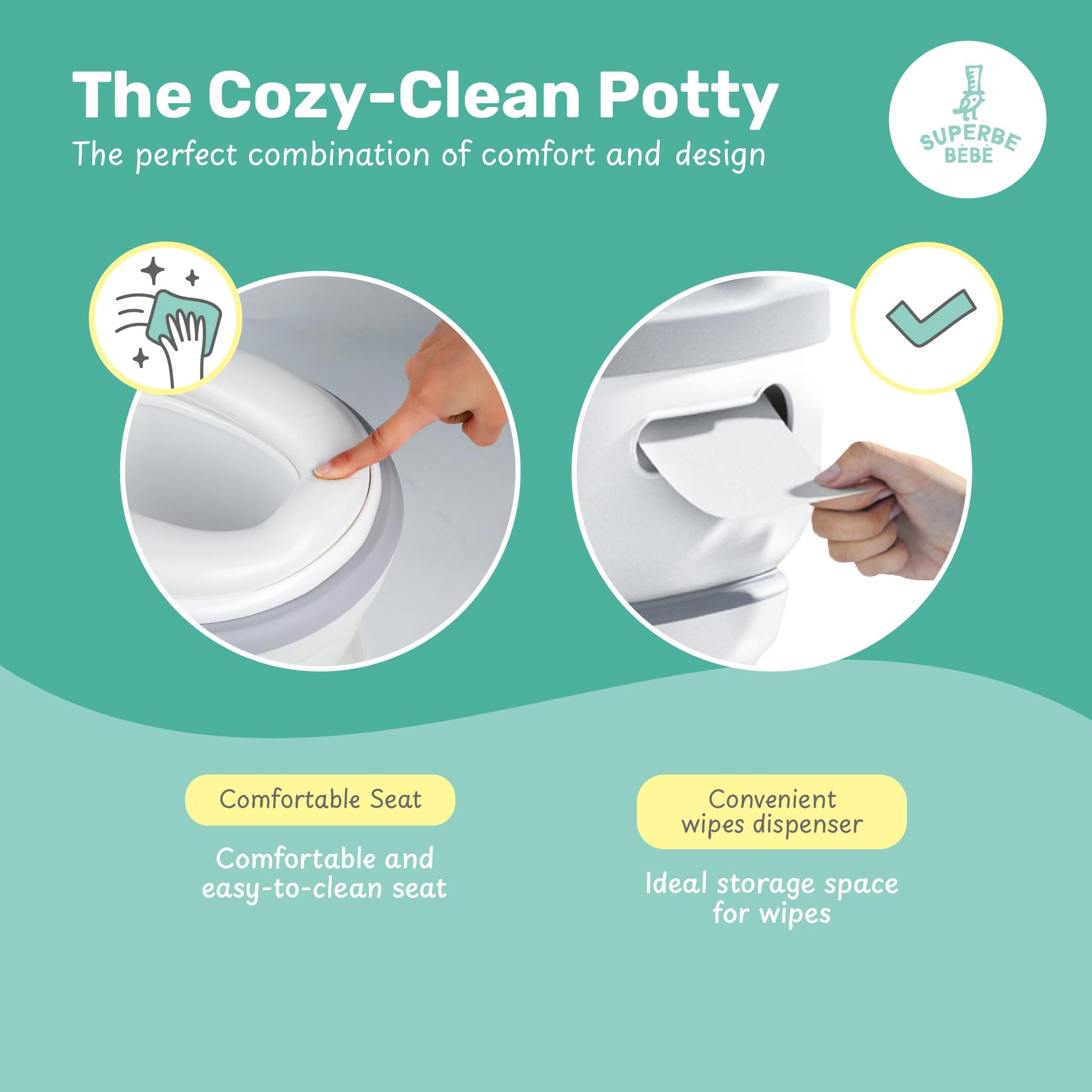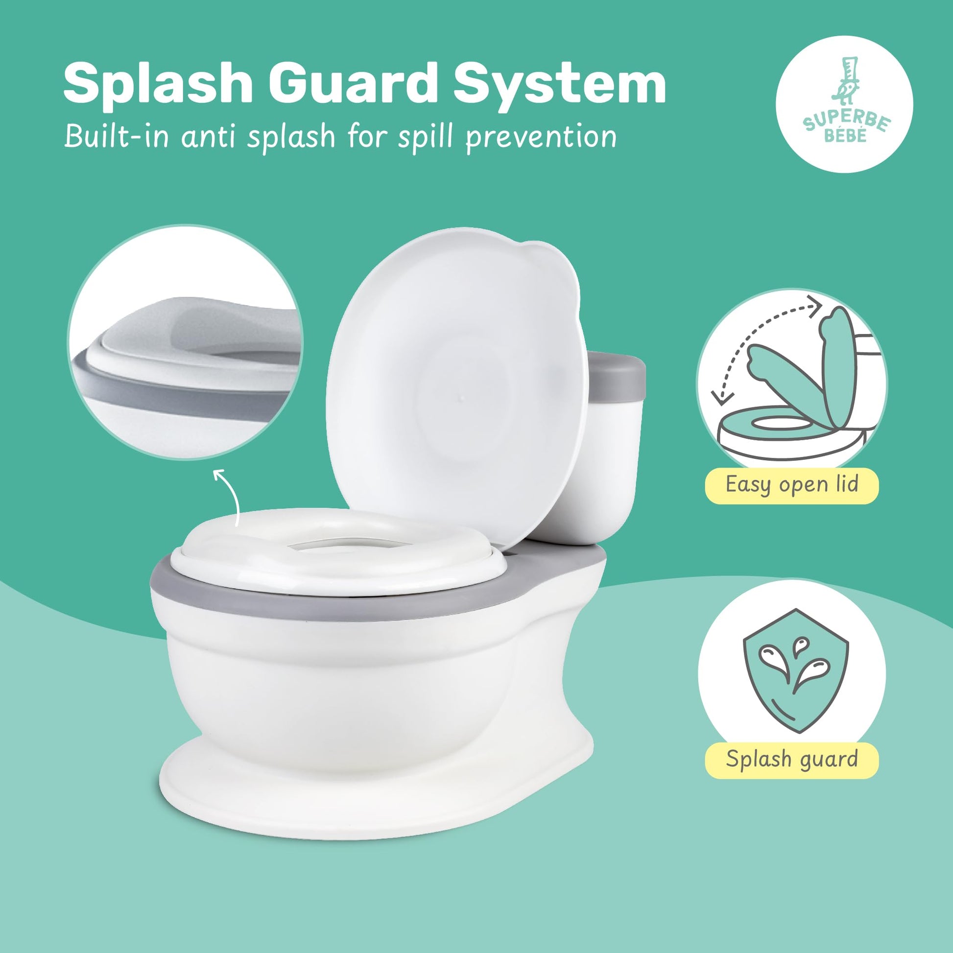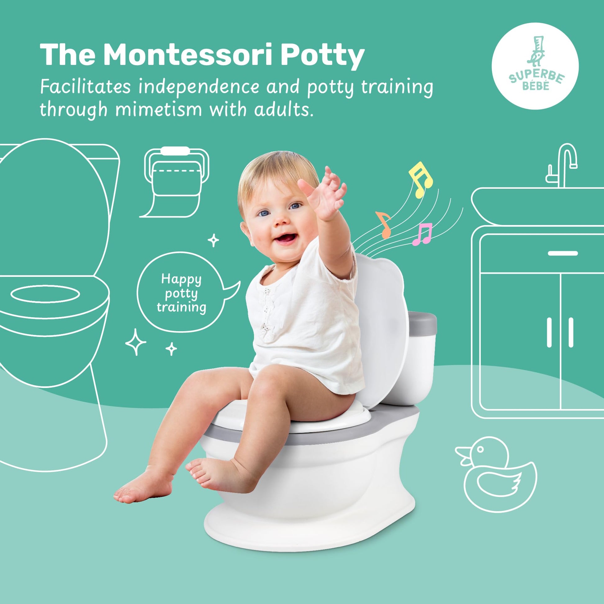 Superbé Bébé heliefektiga treeningpott muudab potitreeningu lapsele lõbusaks ja motiveerivaks. Pott on kujundatud nagu päris WC ning sellel on loputusheli ja muusikaga funktsioonid, mis aitavad lapsel harjuda tualeti kasutamisega mängulisel viisil. Eemaldatav sisuanum teeb puhastamise lihtsaks, samas kui tagumises osas olev panipaik võimaldab hoida niiskeid salvrätikuid käepärast. Libisemiskindel ja stabiilne disain tagab ohutu kasutamise nii kodus kui reisil.