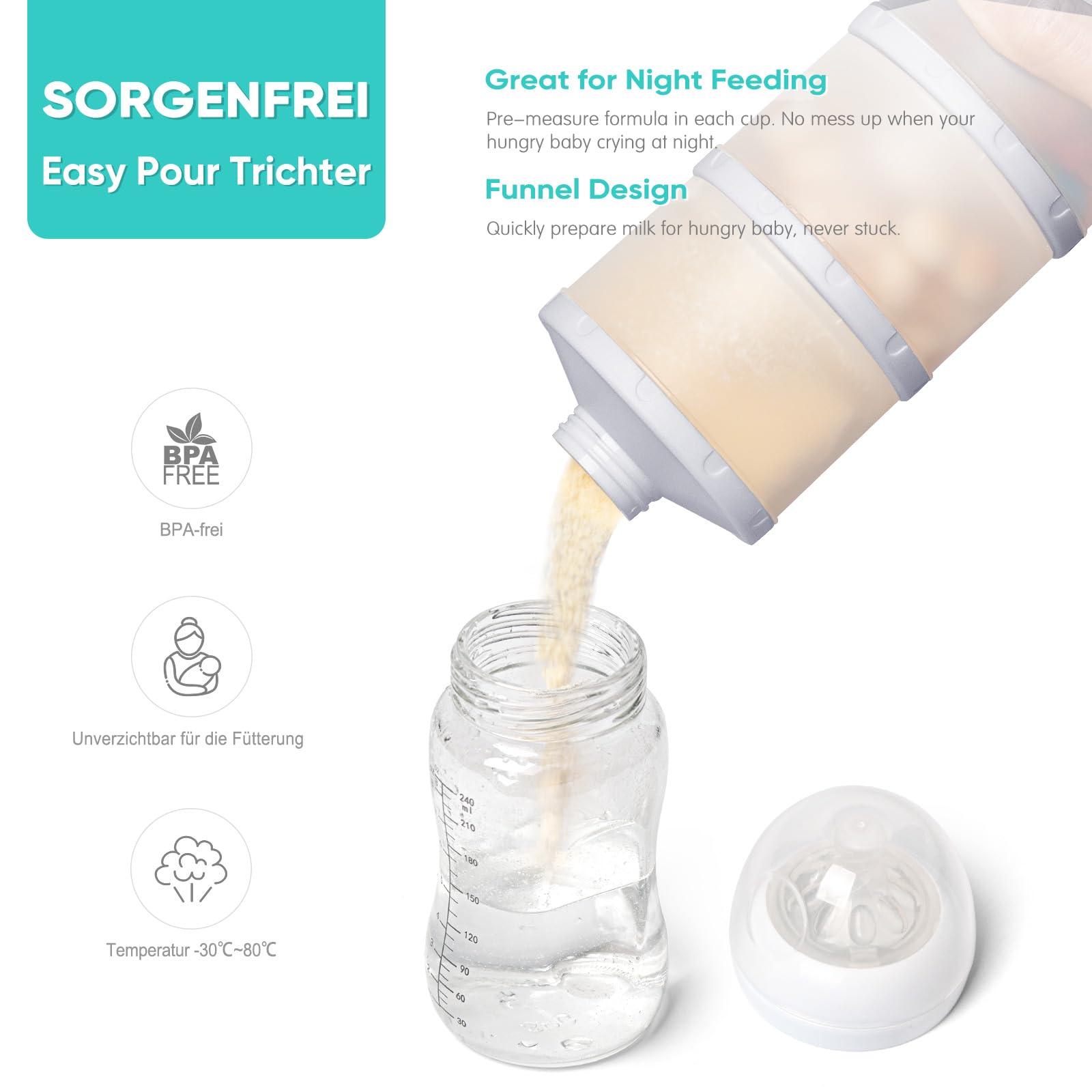 Termichy piimasegupulbri dosaatorid on mõeldud mugavaks ja hügieeniliseks toitmise korraldamiseks nii kodus kui ka reisil. Iga anum mahutab kuni 60 g piimasegu, mida saab ette valmistada ja lihtsalt pudelisse valada. Virnastatav disain võimaldab kaasa võtta mitu portsjonit või erinevaid toiduaineid, näiteks putru või pähkleid. Tänu lehtrikujulisele avausele saab pulbri kiiresti ja puhtalt pudelisse kallata ka öösel või autos olles. Toode on nõudepesumasinas pestav ja hõlpsasti puhastatav.