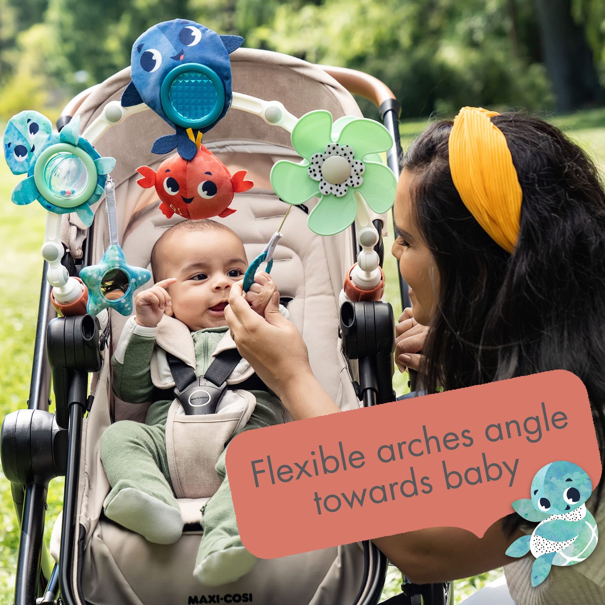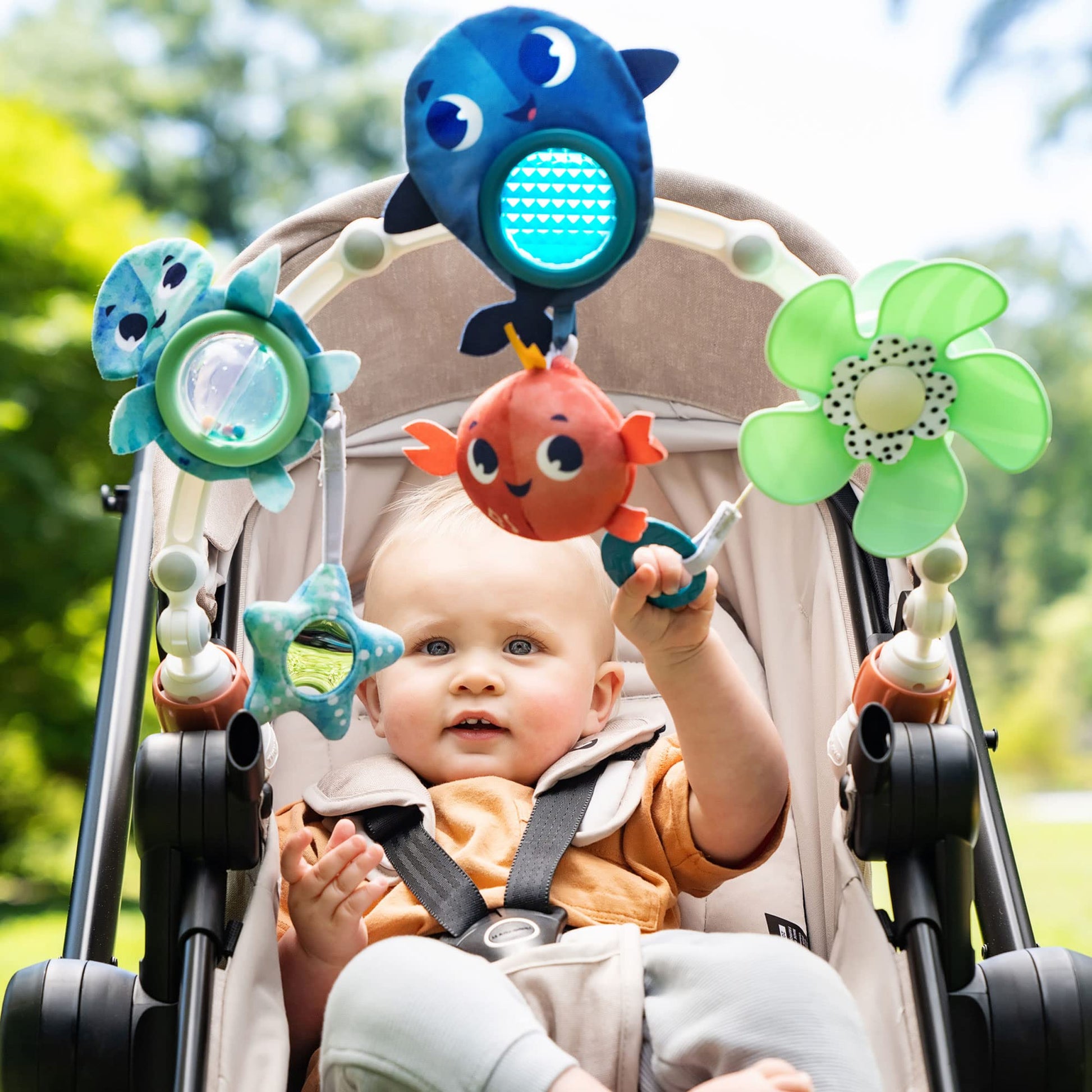 Tiny Love Treasure the Ocean mängukaar pakub lapsele lõbusat ja arendavat tegevust jalutuskäigu ajal. Universaalsete klambrite abil saab kaare kinnitada jalutuskärule, turvahällile või vankrikorvile. Painduvad kaared võimaldavad mänguasjade asendit kohandada vastavalt lapse vanusele ja oskustele. Komplektis on muusikaline krabimänguasi, mis mängib meloodiaid ja aitab lapsel mõista põhjus-tagajärg seoseid. Merealuse maailma kujundus ja kaheksa erinevat tegevust hoiavad lapse tähelepanu ning toetavad kuue olulise oskuse arengut.
