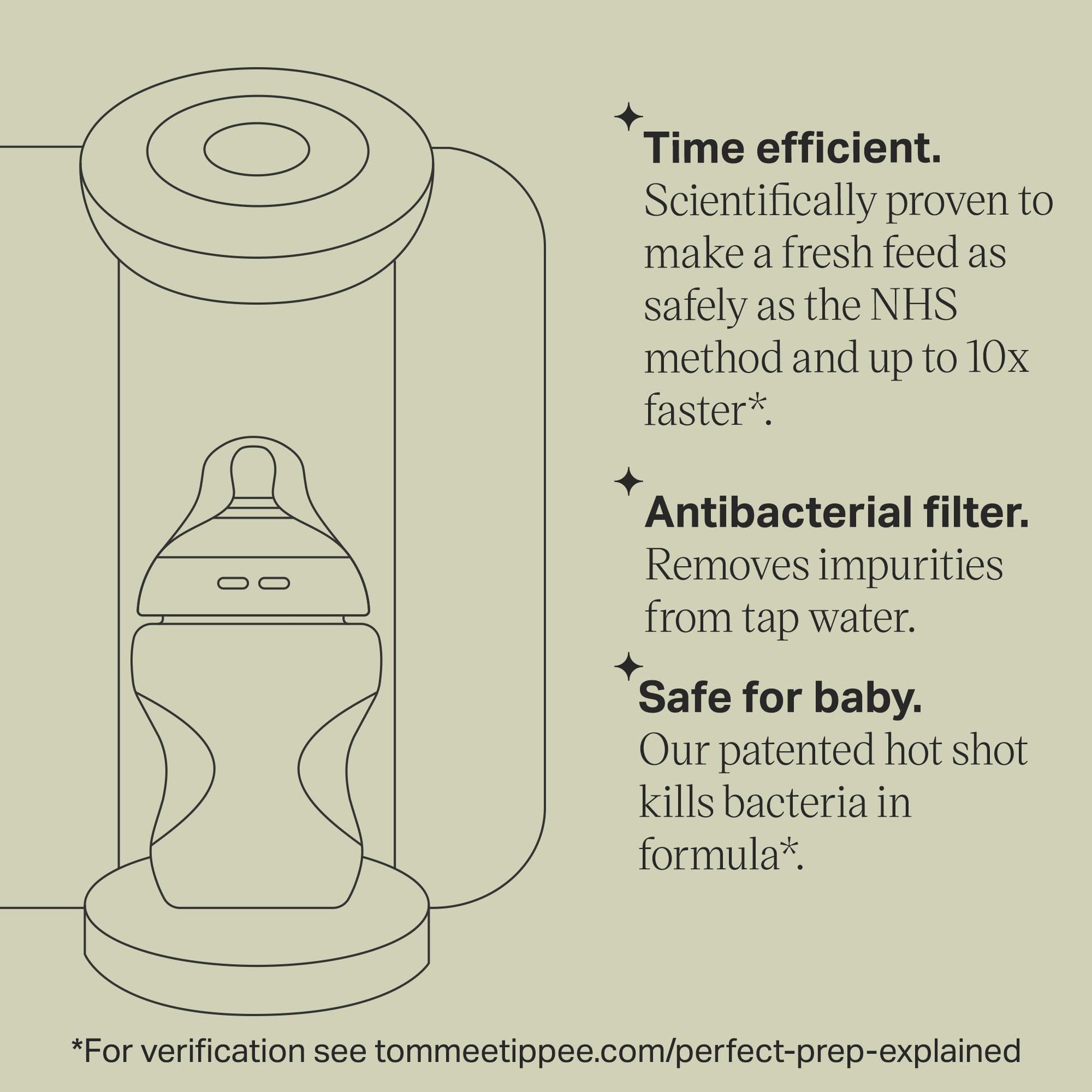 Tommee Tippee Perfect Prep masin valmistab värske piimasegu kehatemperatuuril vaid kahe minutiga – ideaalne, kui beebi on näljane ja aega on vähe. Seade kasutab kraanivett, mille filtreerib spetsiaalne antibakteriaalne filter, eemaldades bakterid ja muud saasteained. Masin sobib kõigile piimasegudele ja võimaldab valida täpse koguse (120–330 ml). Nutikad märgutulukesed annavad märku, kui on aeg puhastada või filter välja vahetada. Energiasäästlik ja praktiline igapäevaseks pudelitoitmiseks.